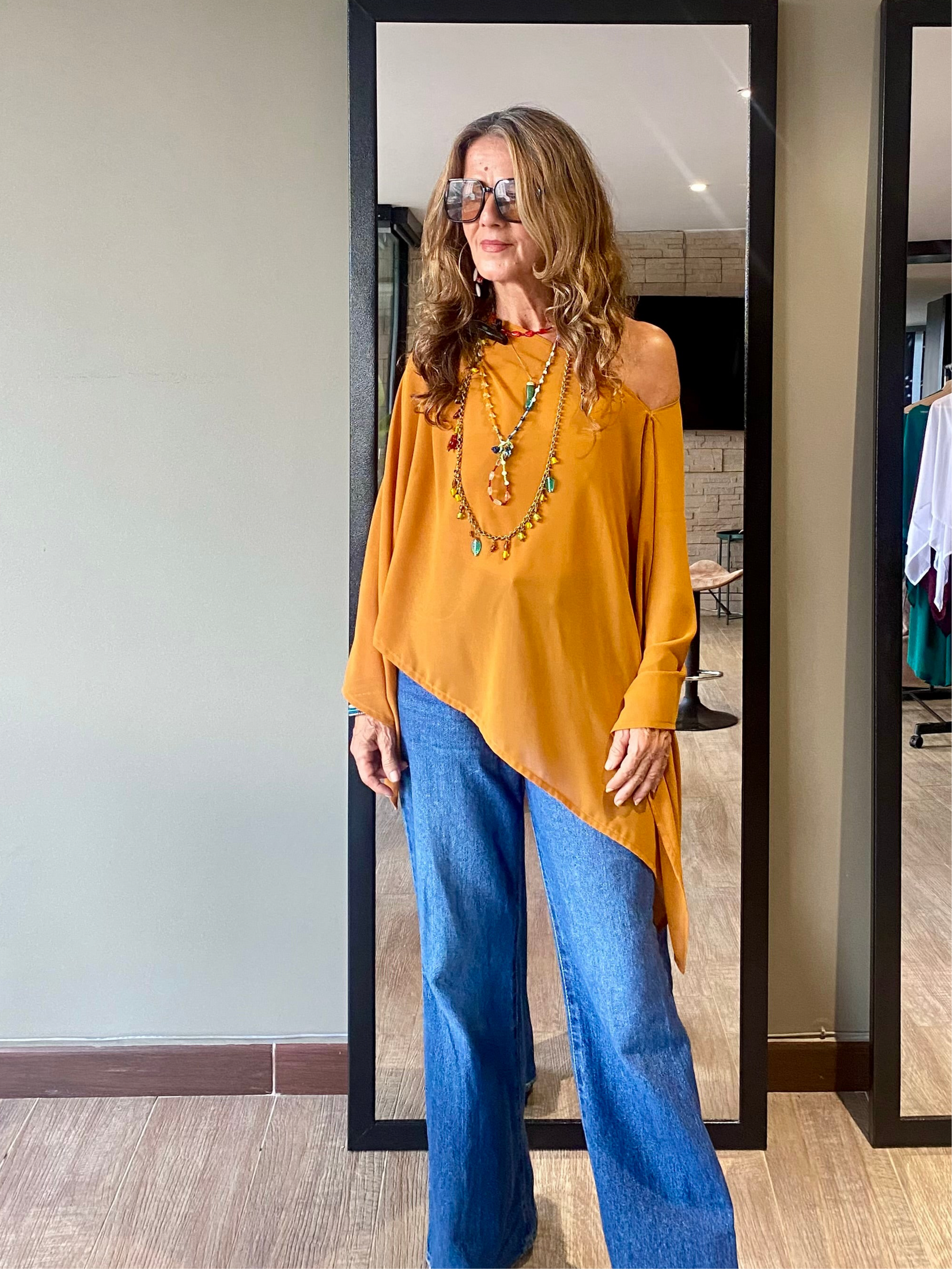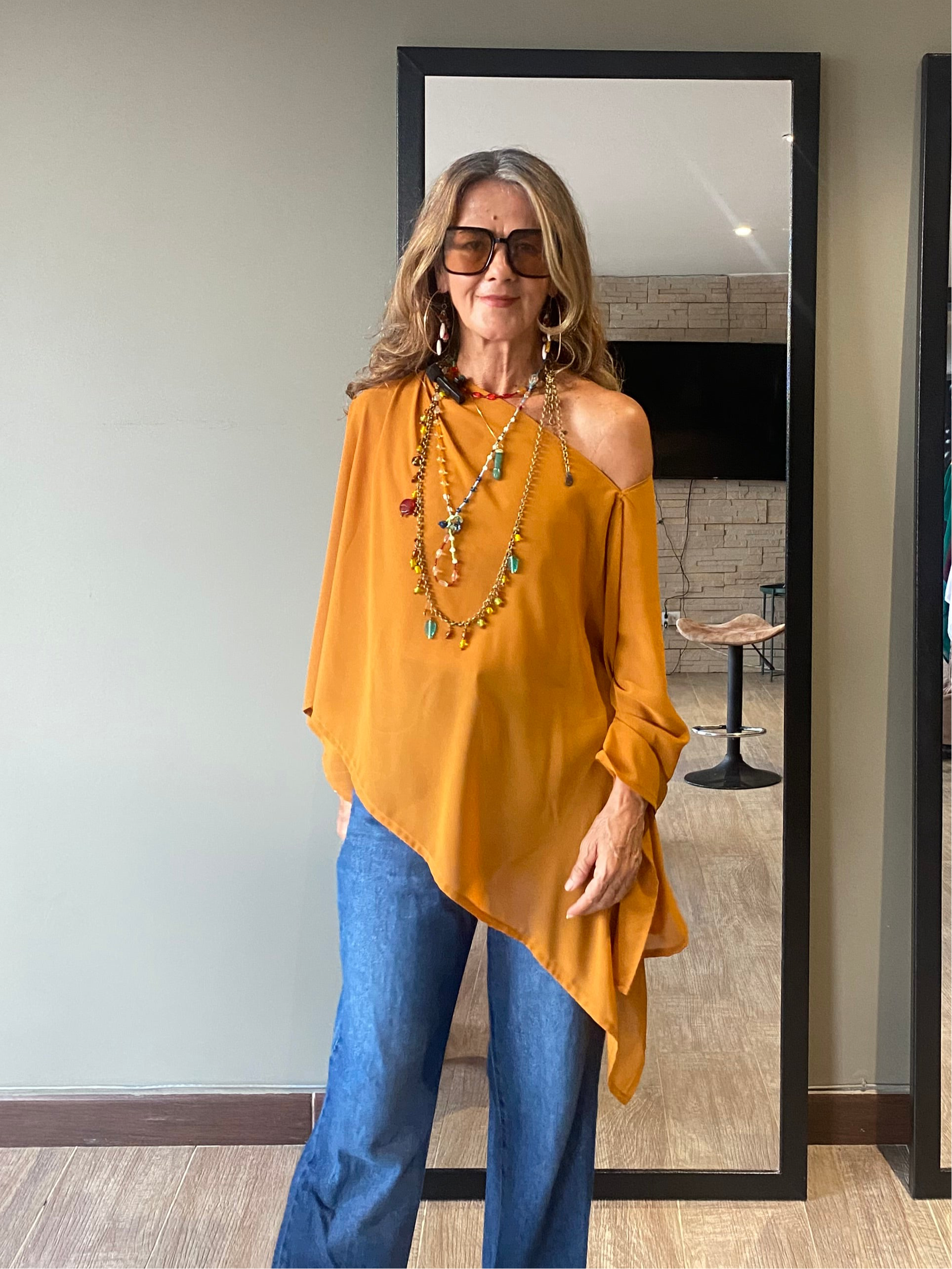 El blusón tipo poncho se transforma en múltiples estilos: úsalo de un solo hombro, con cuello en V, ajustado a la cintura o con cuello recto.