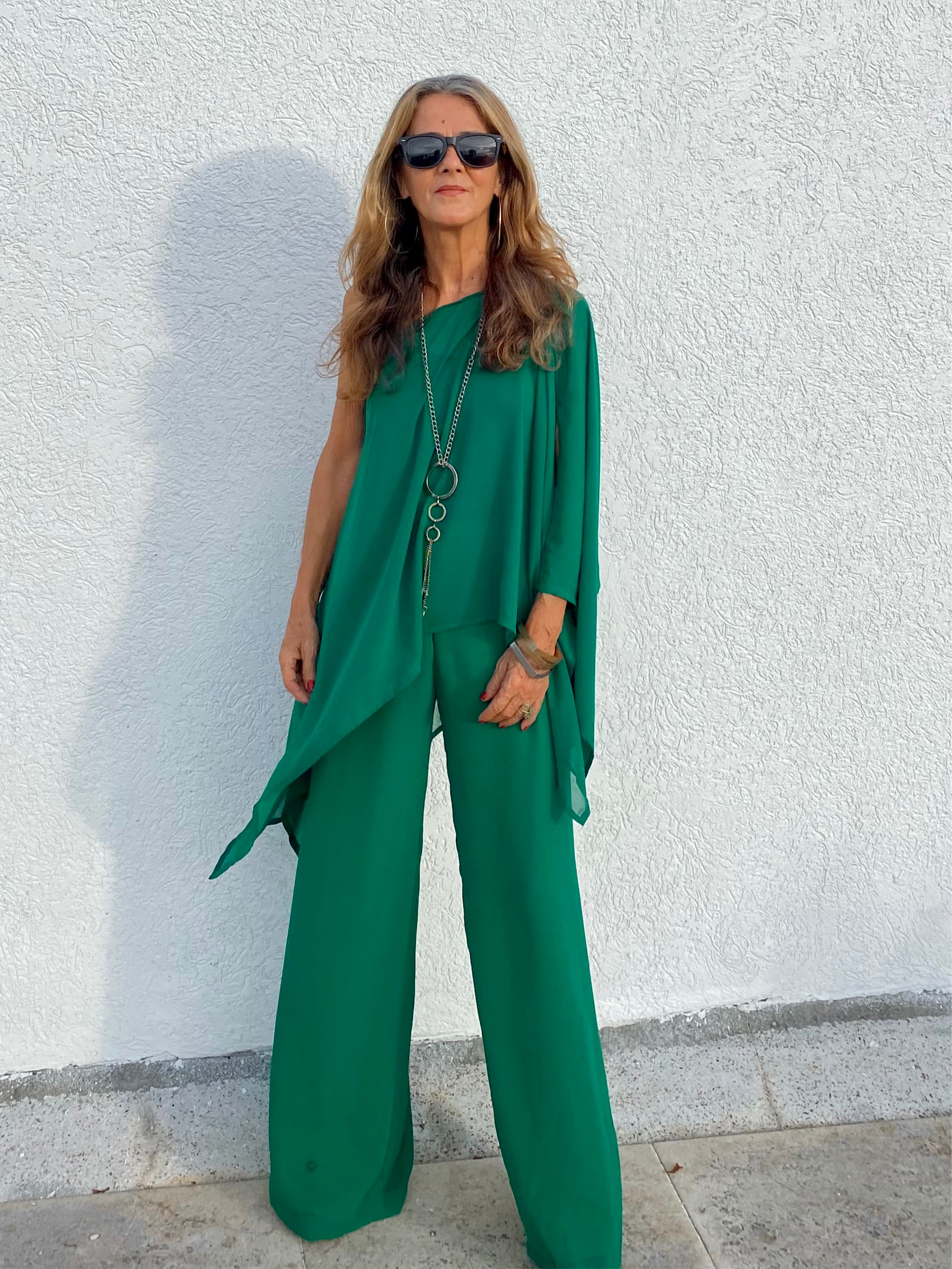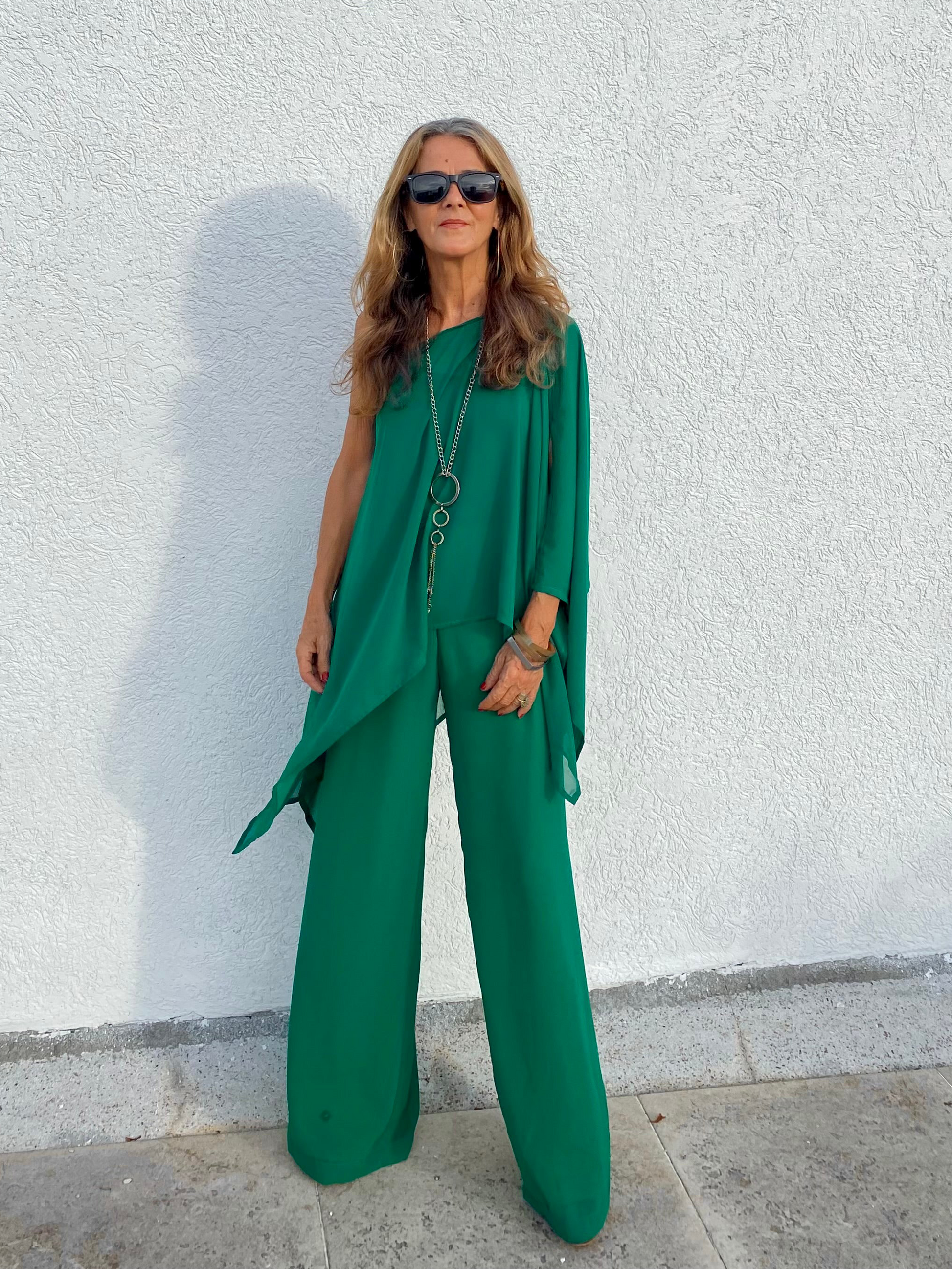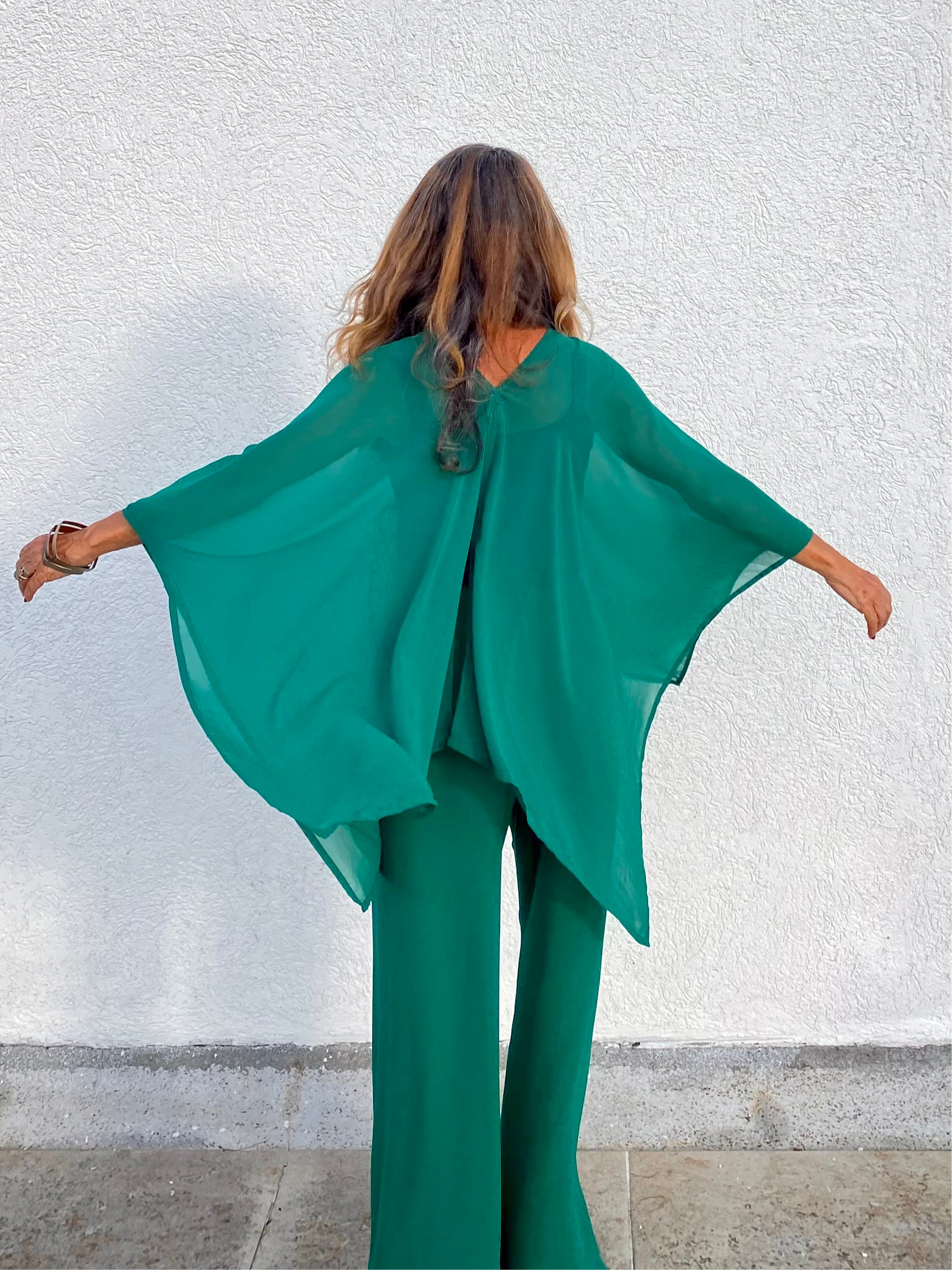 Este conjunto es ideal para un matrimonio, un evento especial o cualquier ocasión que requiera un look elegante, fresco y de calidad impecable. Elaborado en Chiffon una tela es ligera, fresca y con la ventaja de no arrugarse, lo que lo convierte en la opción perfecta para viajar y siempre lucir impecable.