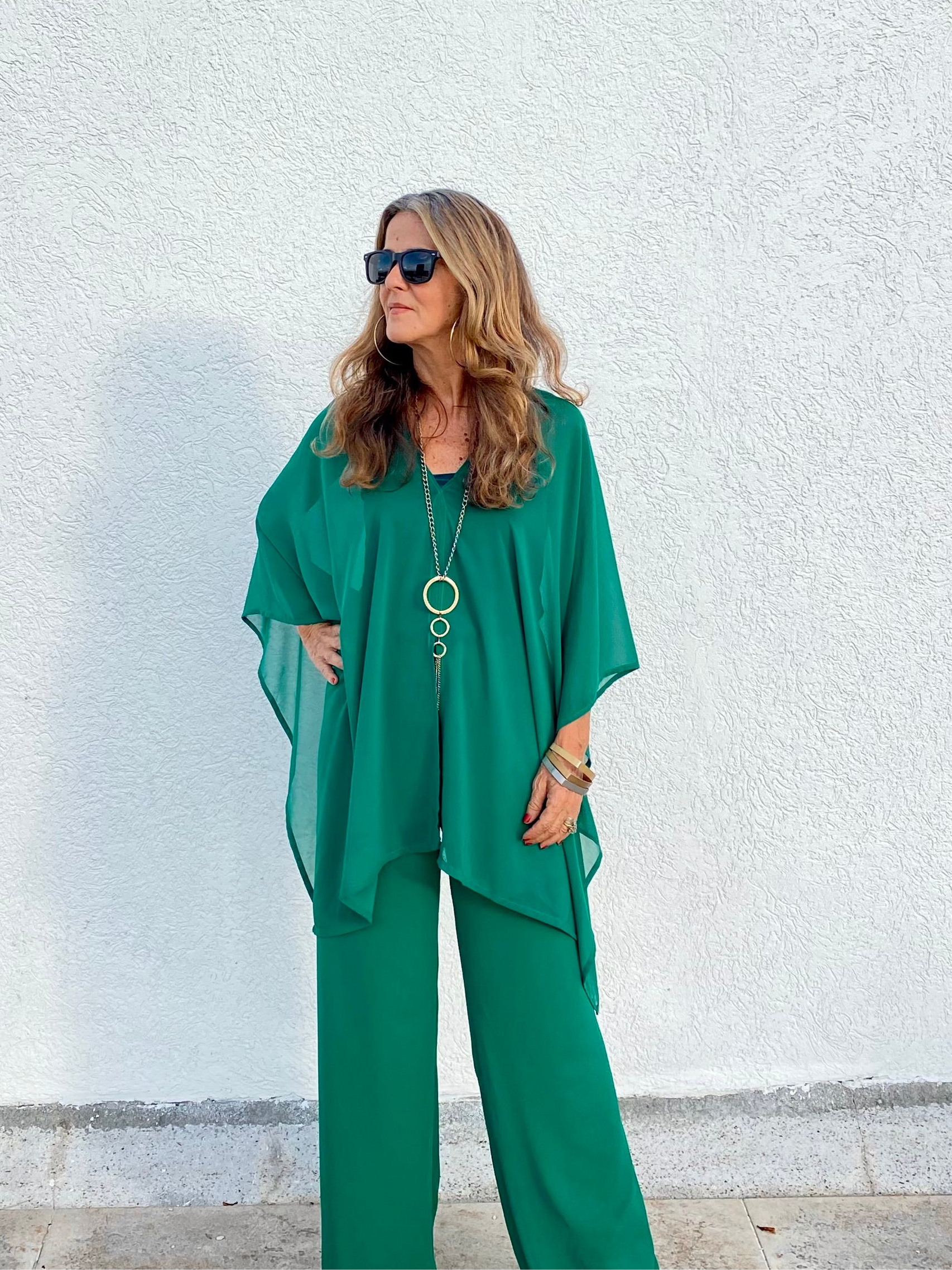 El Conjunto Indonesia es una declaración de versatilidad. Compuesto por un blusón tipo poncho, una básica de tiras y pantalón, se adapta a diferentes estilos y ocasiones con total facilidad.