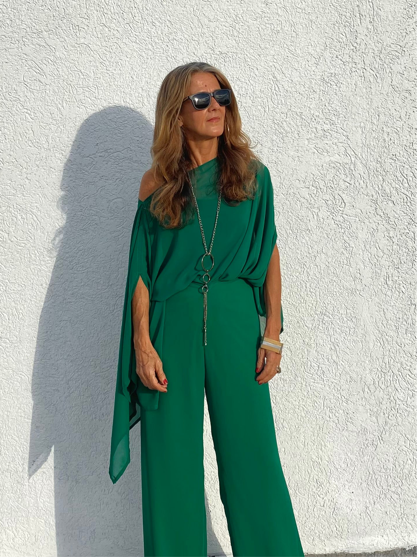 El blusón tipo poncho se transforma en múltiples estilos: úsalo de un solo hombro, con cuello en V, ajustado a la cintura o con cuello recto. Su diseño permite jugar con la forma de llevarlo y crear distintos looks a partir de una sola prenda. El pantalón bota recta con cremallera, que incorpora un forro para mayor estructura y caída perfecta. Realza la silueta con una horma impecable y favorecedora en todo tipo de cuerpos.