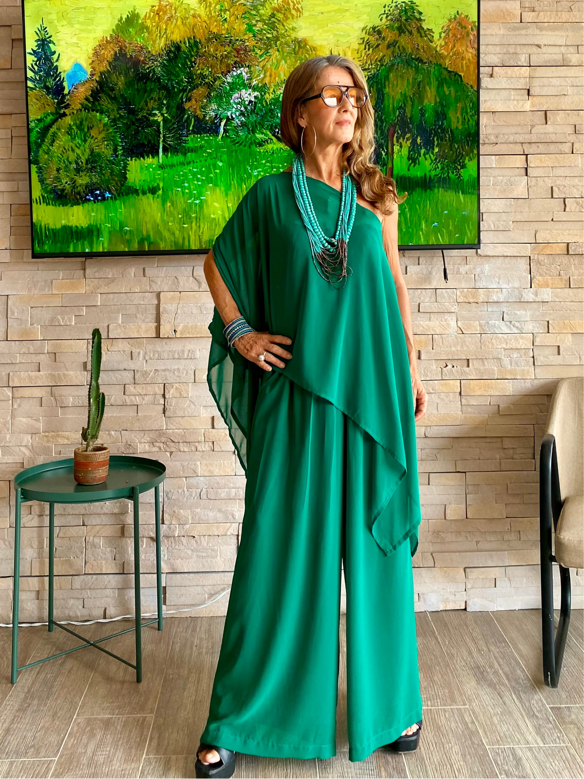 El blusón tipo poncho se transforma en múltiples estilos: úsalo de un solo hombro, con cuello en V, ajustado a la cintura o con cuello recto. Su diseño permite jugar con la forma de llevarlo y crear distintos looks a partir de una sola prenda. El pantalón amplio con resorte en la cintura —doble y fluido para máxima comodidad