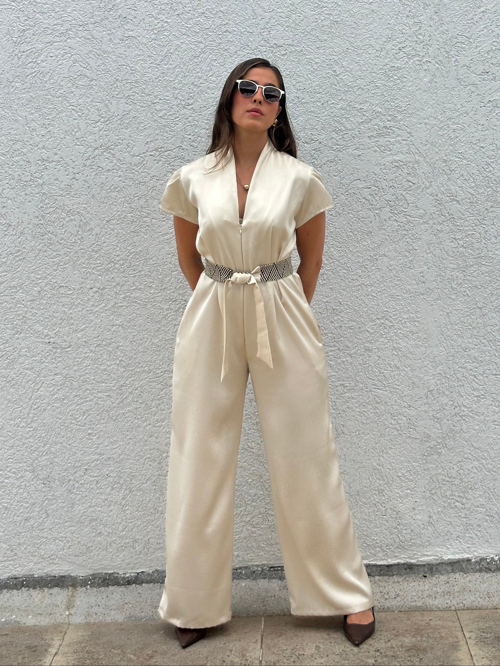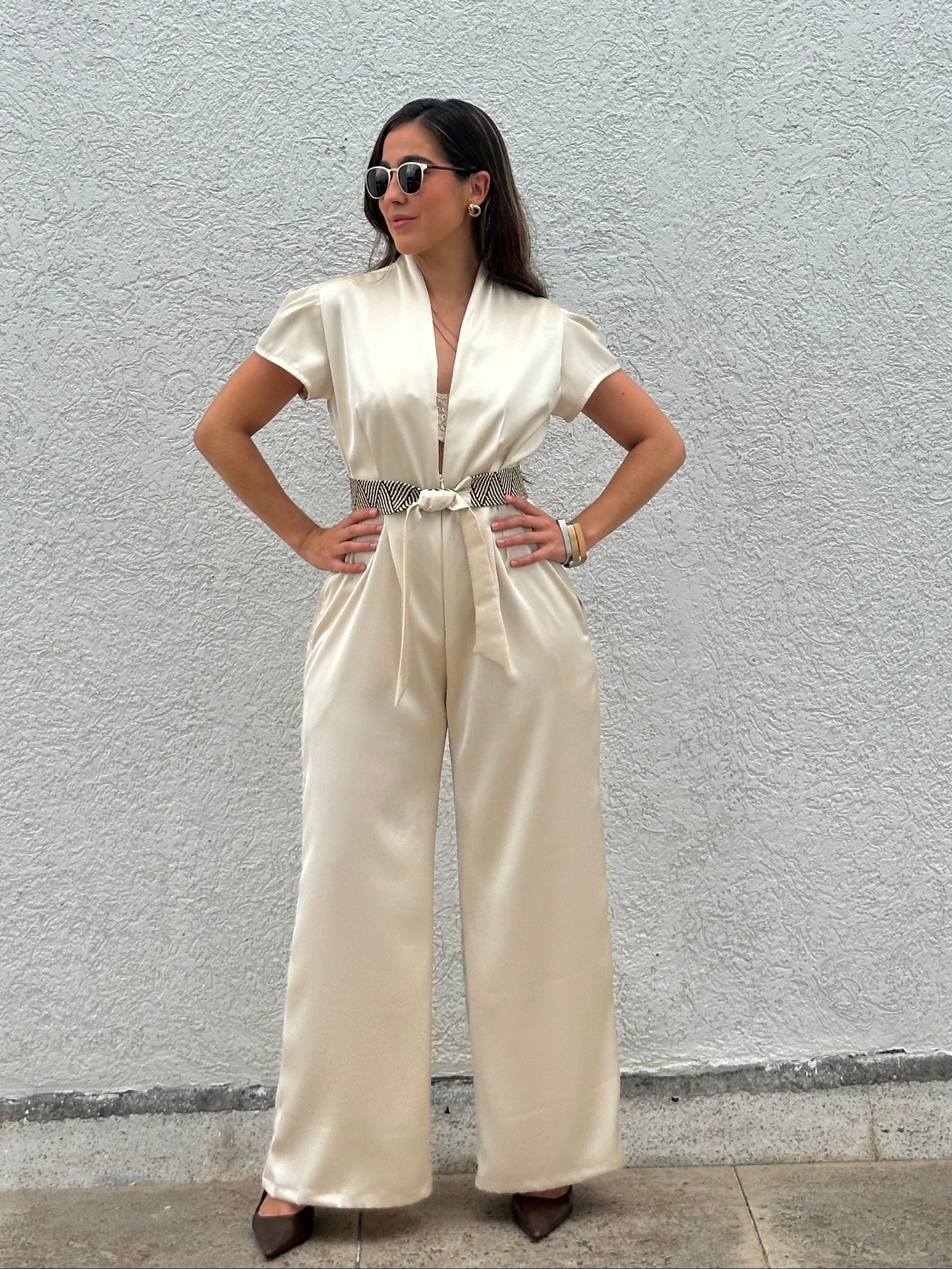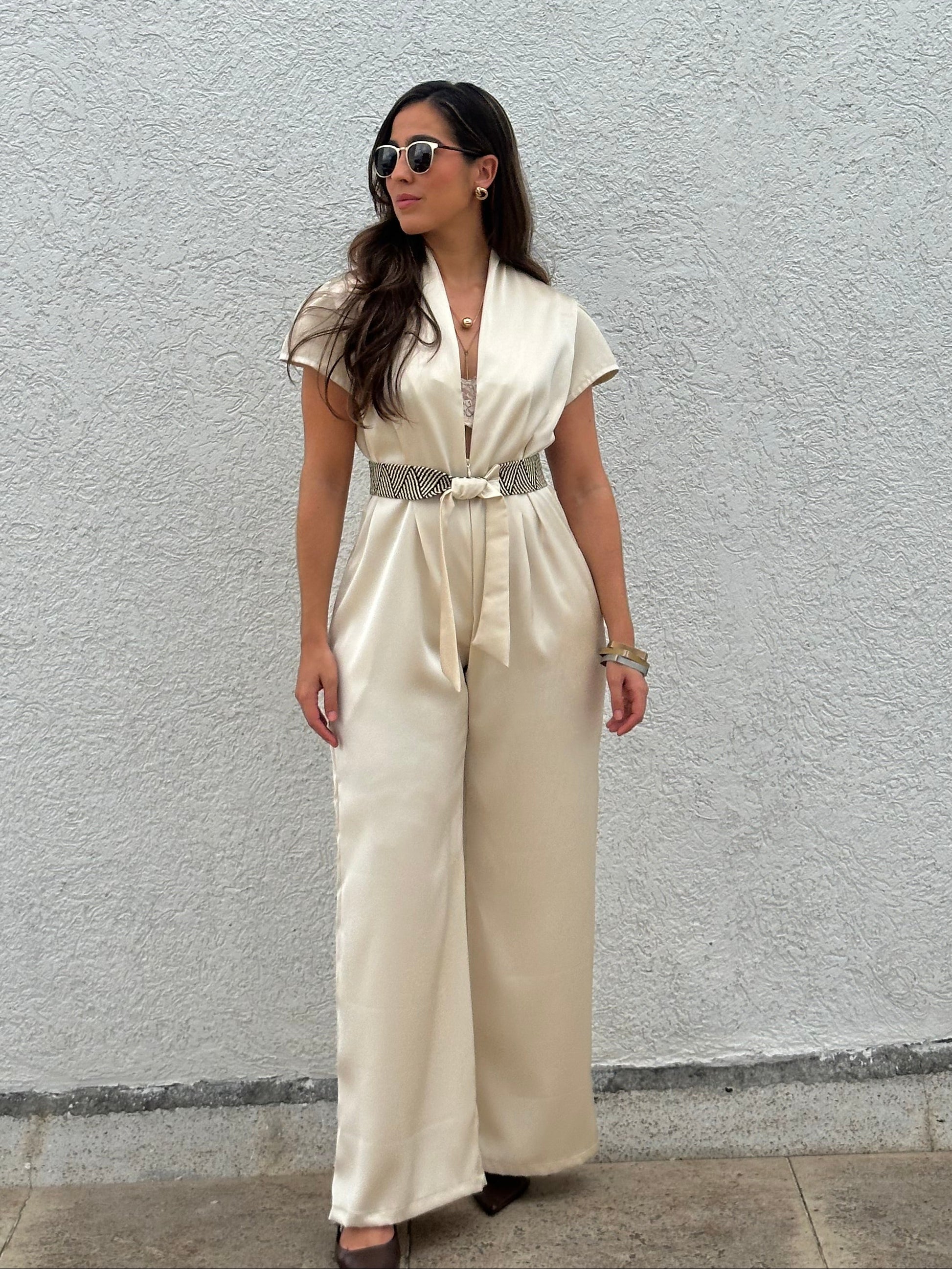 Elaborado en satín de alta calidad, esta pieza se destaca por su textura suave y su sutil brillo, logrando un look sofisticado sin esfuerzo. Su diseño crea una silueta equilibrada y favorecedora, ideal para diferentes tipos de cuerpo.