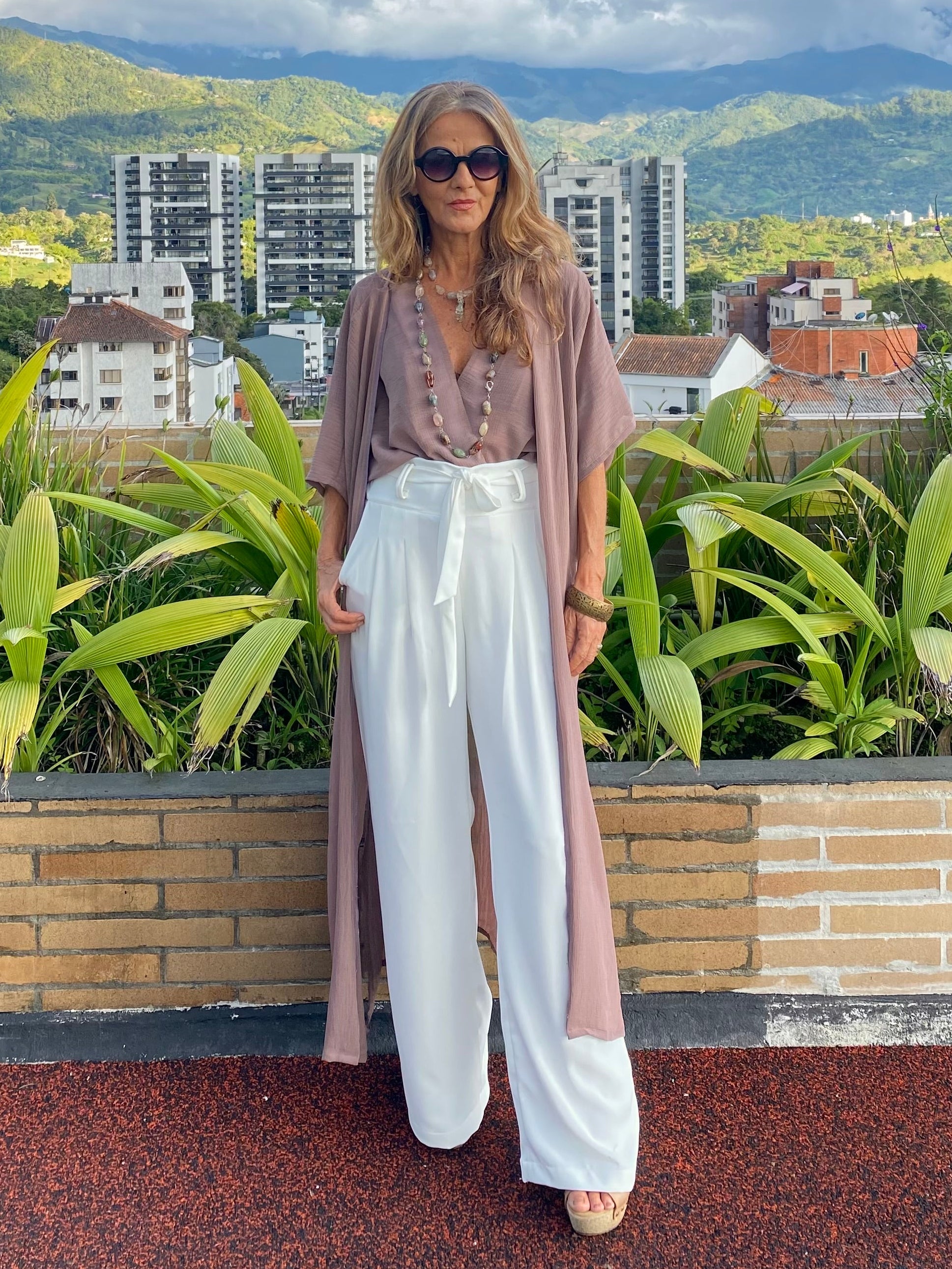 El Kimono Gaia es una prenda que redefine la versatilidad y la elegancia. Confeccionado en un chiffon croquelado de textura ligera y sofisticada, se convierte en el complemento perfecto para elevar cualquier look.