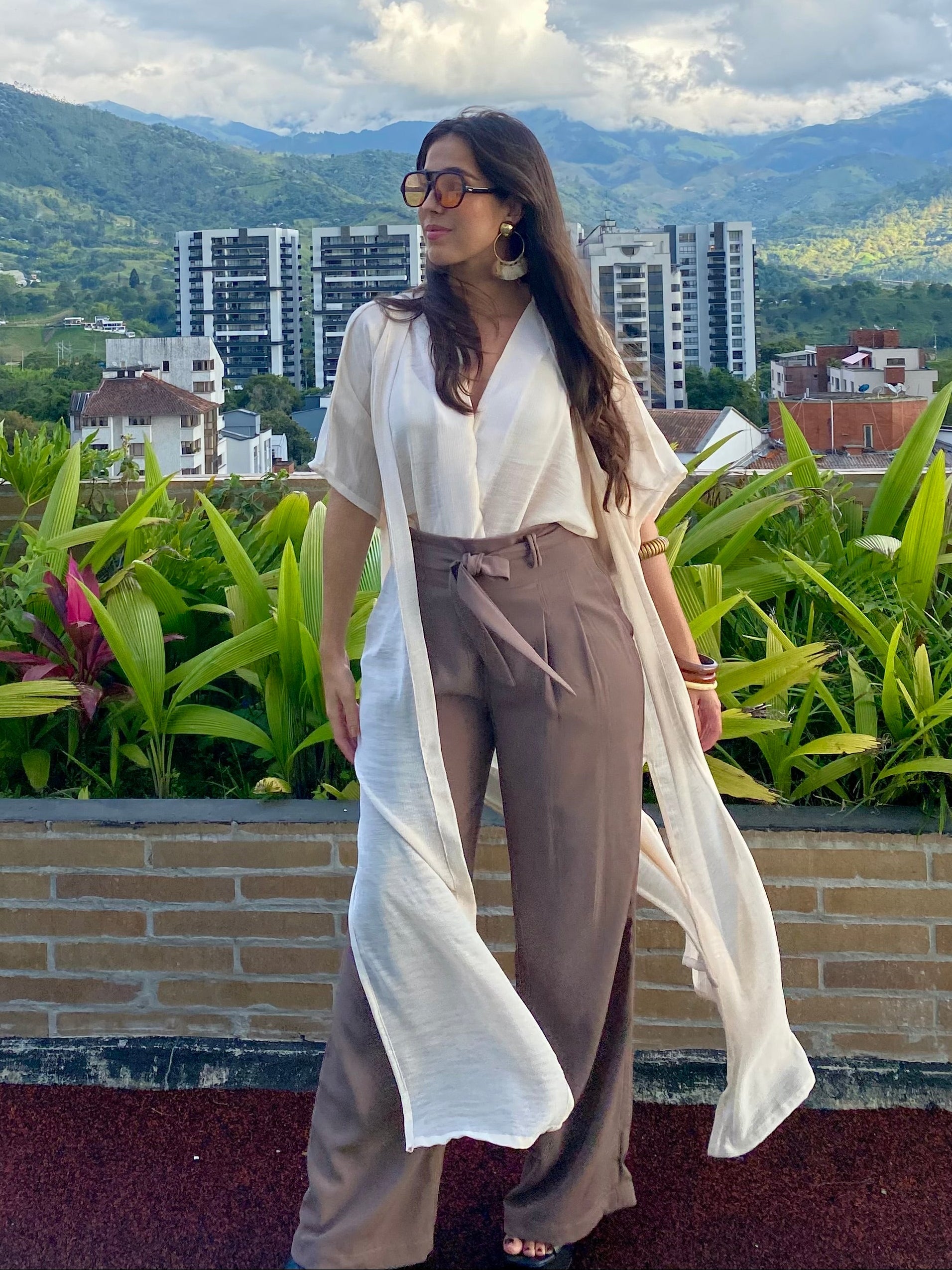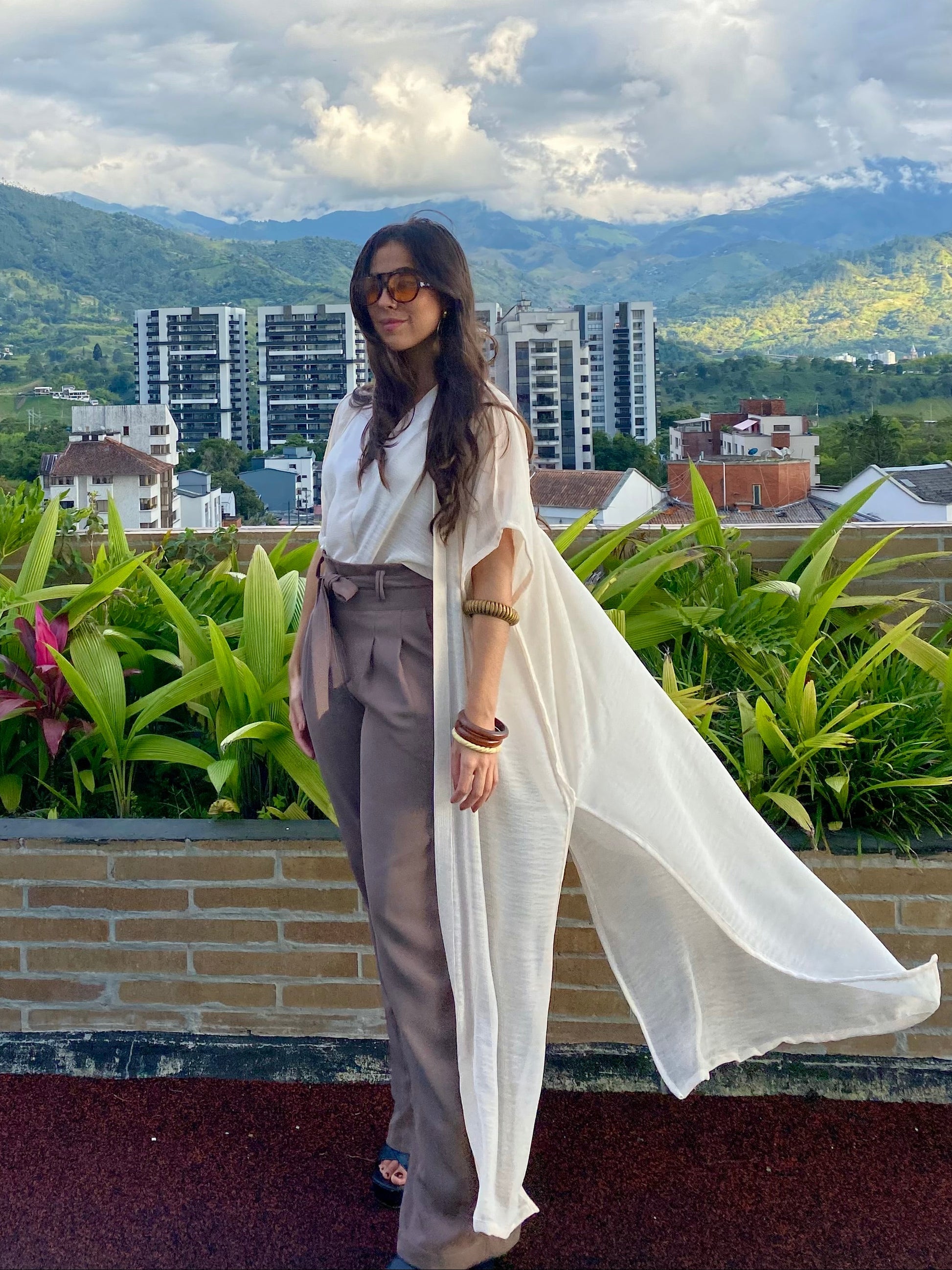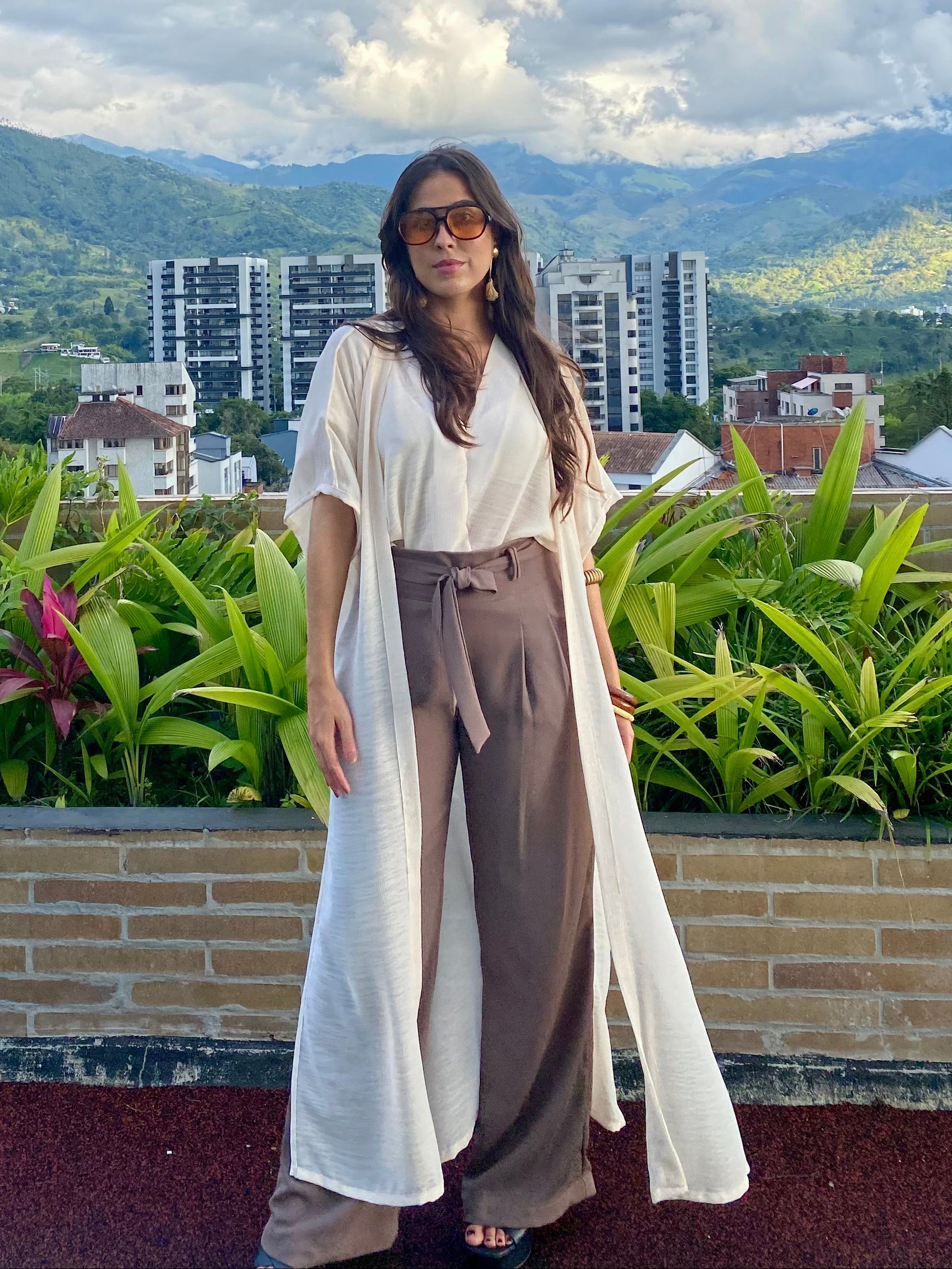 El Kimono Gaia es una prenda que redefine la versatilidad y la elegancia. Confeccionado en un chiffon croquelado de textura ligera y sofisticada, se convierte en el complemento perfecto para elevar cualquier look.